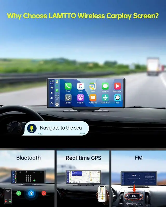 Voice Assistant for Easy ControlThe Bluetooth 5.0 hands-free system and built-in clear mic allows you to answer the phone while driving, without having to hold your phone all the time, and support voice control at the same time, so you will always keep your eyes on the road ahead, and ensure that you reach your destination safely. The wireless carplay has built-in speakers as well as an FM transmitter to allow you to broadcast your music from your phone to your car speakers via the radio.