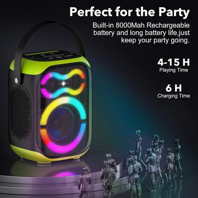 It's built-in 8000mAh rechargeable battery, providing up to 4~15 hours play time ( depends on playing volume). You can enjoy the carnival whether it is an indoor or outdoor dance party.