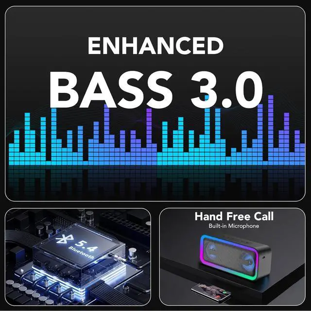 Powerful BassThis speakers bluetooth wireless features an upgraded bass enhancement algorithm and dual passive radiators, meticulously tuned to deliver deep bass down to 50Hz. Compared to standard compact speakers, our model offers significantly improved low-frequency response efficiency, delivering punchy bass with distinct layers and impressive elasticity.