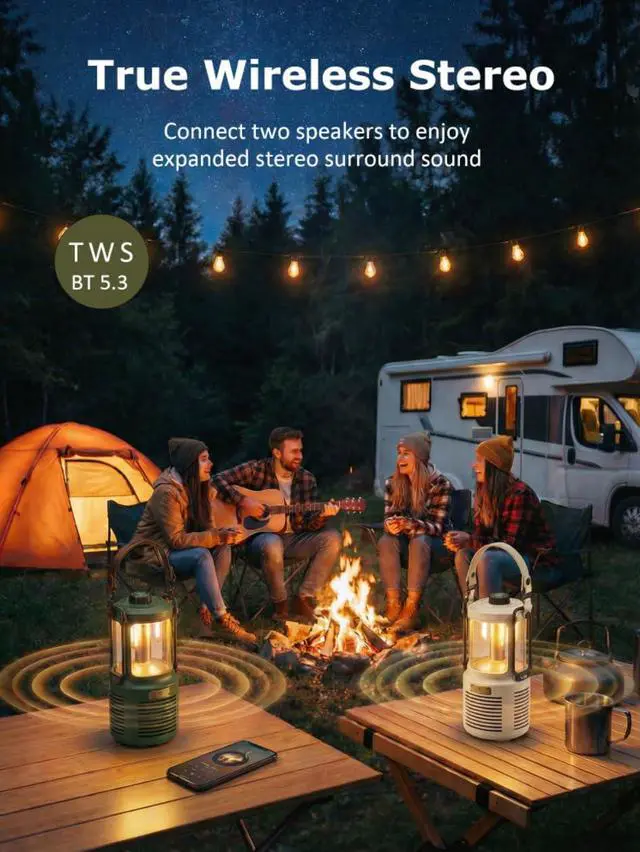 Ultra-Portable Design Supports upright & hanging placement, with a 1/4-inch threaded base compatible with camera tripods. Bluetooth 5.3 enables instant pairing with phones, laptops and more, ideal for camping, small gatherings, hiking and home use.