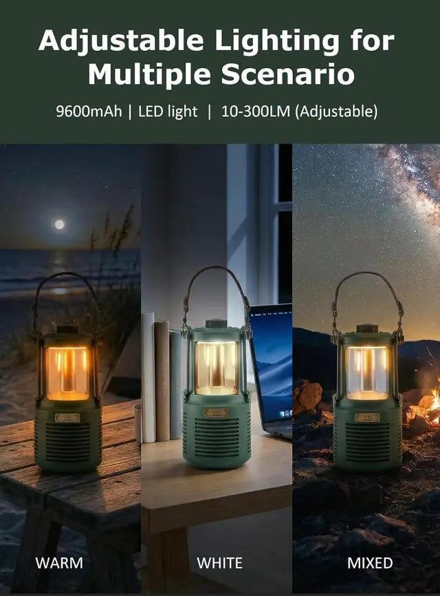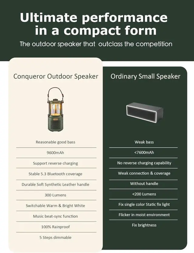 Ultra-Long Battery & LED Light Equipped with a versatile 3-in-1 port and a 9600mAh battery with reverse charging, it features switchable orange-white lighting with music beat sync, plus an IP66 waterproof & dustproof build that stands up to harsh outdoor conditions-ideal for outdoor lighting and audio enjoyment.
