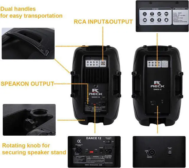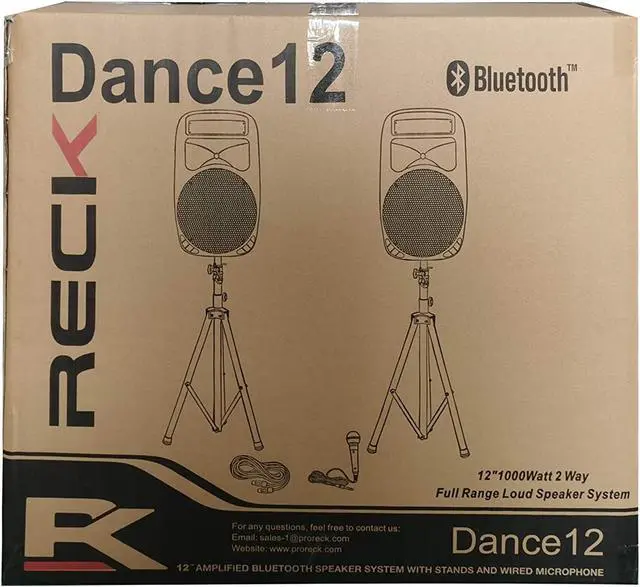 RECK DC 12 Portable PA SYSTEM: 12-Inch 1000 Watts ,150-Watt RMS, 2-Way Powered Dj/PA Speaker System Combo Set consists of (1) active speaker, (1 passive speaker, (2) speaker stands, (1) 30-feet speakon cable, (1) MIC cable, (1) wired mic, (1) remote control , (1) power cable and (1) user manual.