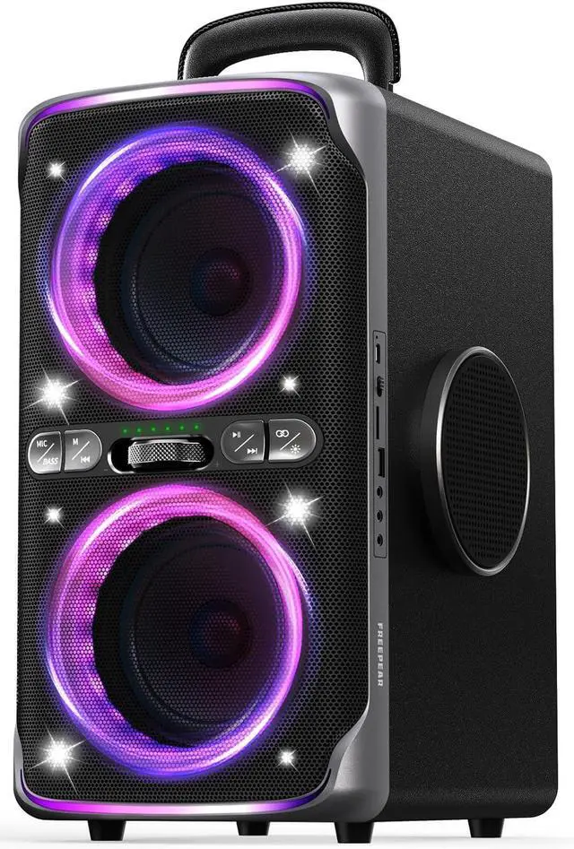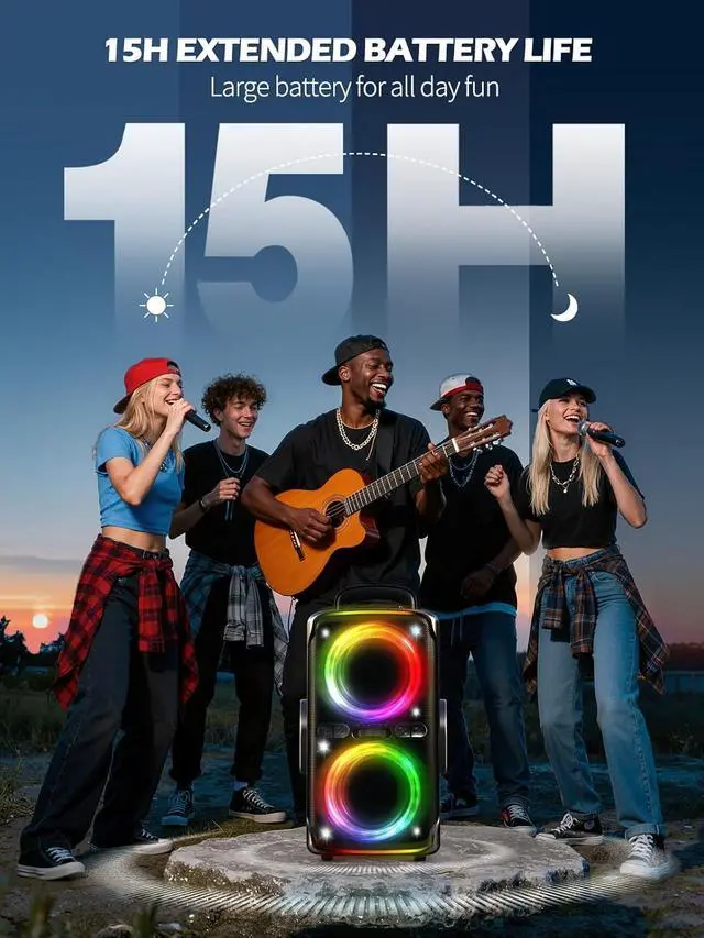 Dazzling Light ShowsLights ignite party vibes! Particles pulse, neon slices, lights swirl to bass. More than a speaker, Large bluetooth party speaker is your party lighting director, spotlighting corners, freezing moments in magic. Music syncs with light show, it's definitely a party atmosphere maker!