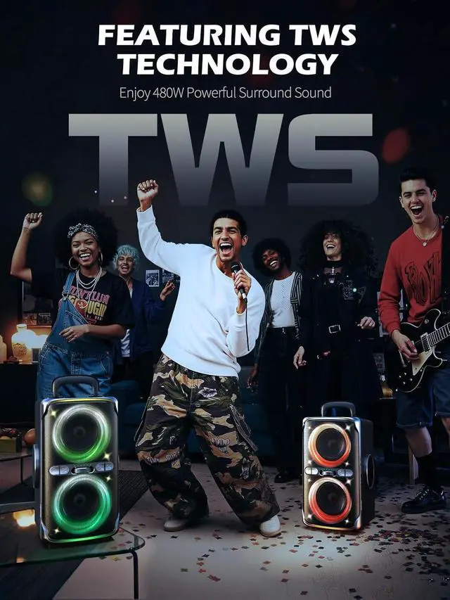 Powerful TWS SurroundPair two portable speakers for 360° sound. Place apart for spatial audio, sync for booming bass. Instant pairing, no cordstwo party box speakers, double the party magic, get 480W max booming sound. Turn your space into a surround-sound dance floor.