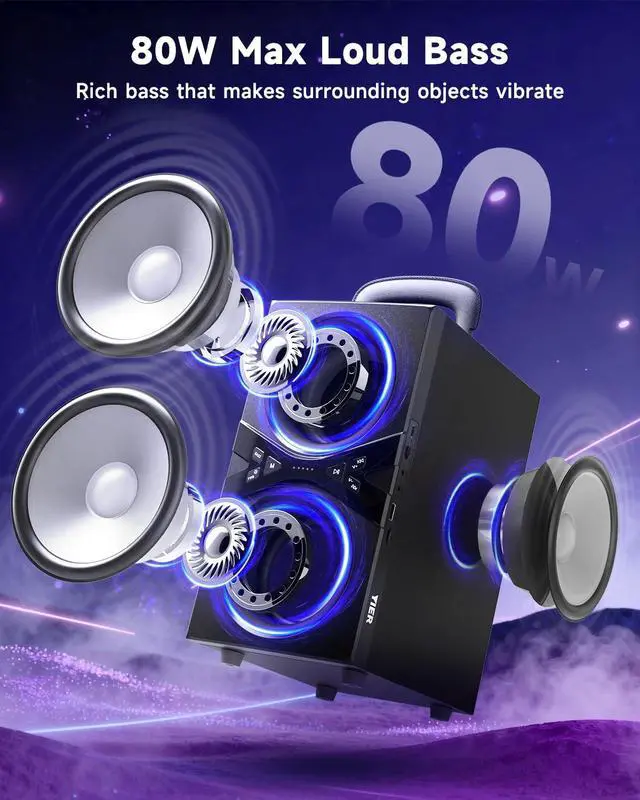 Powerful 80W Party Speaker:This Yier Bluetooth Speaker is a truly high-powered portable Bluetooth speaker, boasting 80W of peak power, powerful enough to power gatherings of any size. Four meticulously tuned drivers (two tweeters and two woofers) work together to produce crystal-clear highs and chest-pounding bass, creating an immersive surround sound experience. Whether you're at a home party or enjoying an outdoor revelry, it's your essential party Bluetooth speaker, boasting resounding, rich, and layered sound.