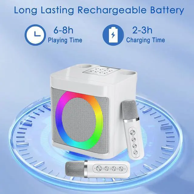 Super Long Battery LifeThis kids karaoke machine has a built-in rechargeable battery that provides up to 8-10 hours of playback. Whether it's a birthday party, classroom activity or outdoor adventure, this portable Bluetooth speaker and wireless microphone will keep the fun going.