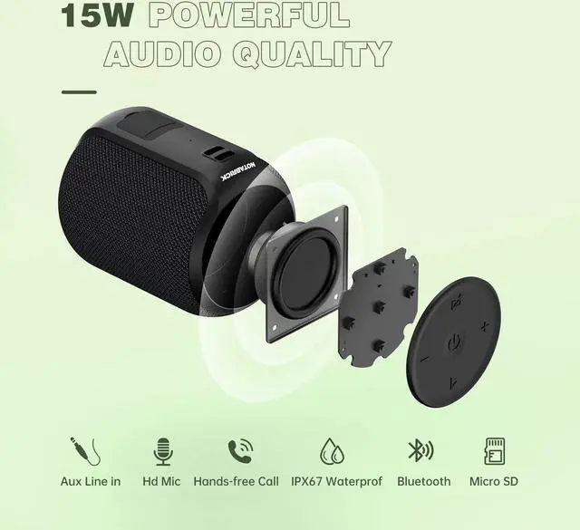 Size and weight5.43 x 3.78 x 3.82 inches, 1.03 pounds Power15WWaterproof RatingIPX67Accessory1×Charging line; 1× AUX lineRecommended charging voltage5V/ 1A 30W RGB Rhythm Bluetooth Speakers