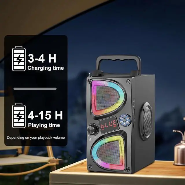 Multifunctional Portable SpeakerSUPNIU portable boombox has built-in the most advanced Bluetooth 5.0 technology, which can quickly connect to any device with Bluetooth. The A50 wirless speaker is equipped with two batteries, the total battery is 4000 mAh. In addition, the display screen of the outdoor speaker also displays the remaining battery level. This clever design allows you to easily measure the remaining power, ensuring that you are caught off guard when the battery runs out.