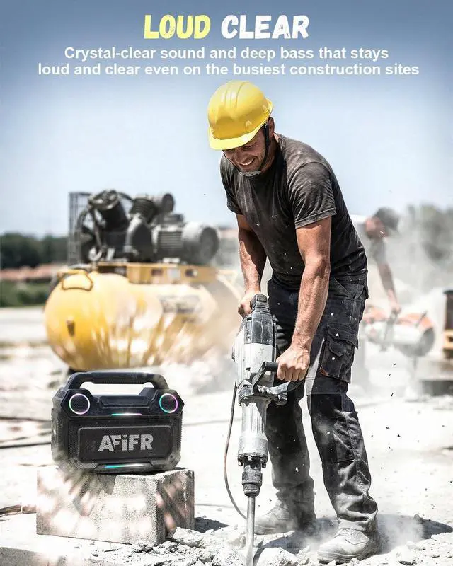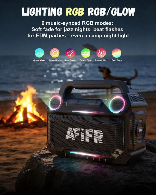 1TWS&PARTY2IP67 WATERPROOF3RGB LIGHT SHOW Sound160W Bass of soundAmplifier DSP Deep BassWoofer 3.5" x2 WoofersBattery15000mAh Lithium-ion batteryBluetooth 5.3 bluetooth connectivity up to 100 feet for epic rangeTouch ControlsFor quick actions (BASS stereo, party mode, play/pause, next, & volume, TWS pairing)Height 9.1 inchesWidth 11.8 inchesDepth 5.2 inchesWeight 7.3 poundsBattery Life24 Hour PlaytimeStereo PairingTWS stereo pairing for true surround sound with two AFIFR speakersParty modeRGB Lighting 6 music-synced RGB modes