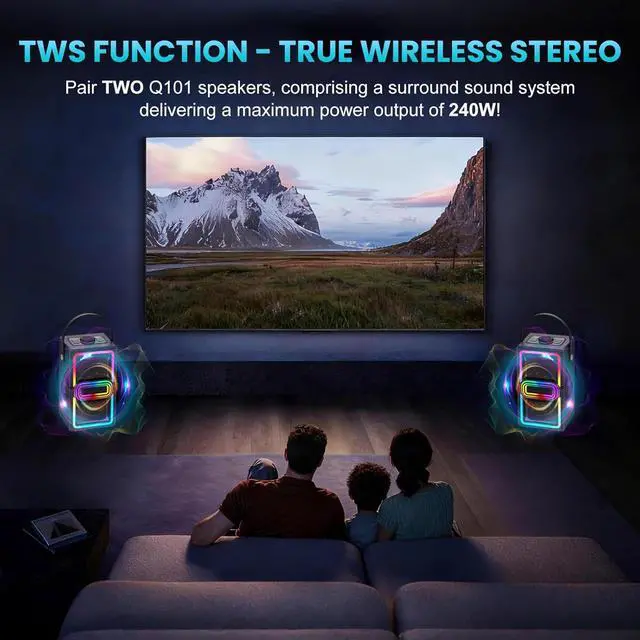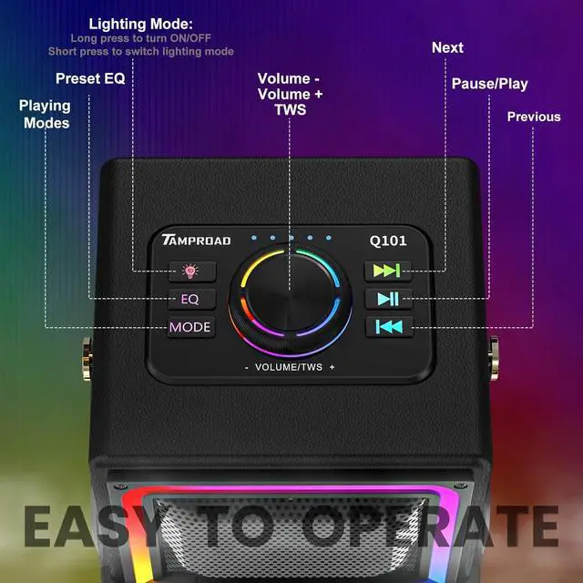 Supports TWS Stereo System - Pair 2 of TAMPROAD Q101 portable wireless speaker to get the TWS function and a fully immersive and spatial audio experience. Whether you're using it for karaoke, playing music, or home theater, the TWS stereo surround feature is sure to take your audio experience to the next high level.