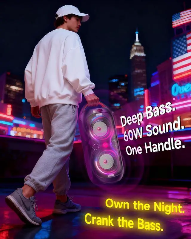 Thunderous Bass, 60W Max Power & Ultimate Portability - Stop compromising on sound. Our upgraded speaker packs a serious punch with enhanced bass and a peak 60W output, all designed into a portable package with a convenient carry handle for music on the move.