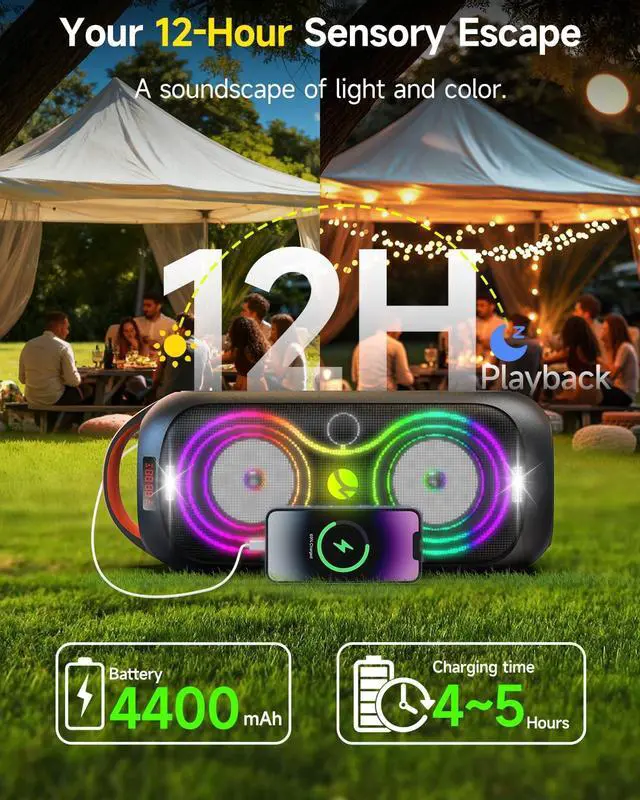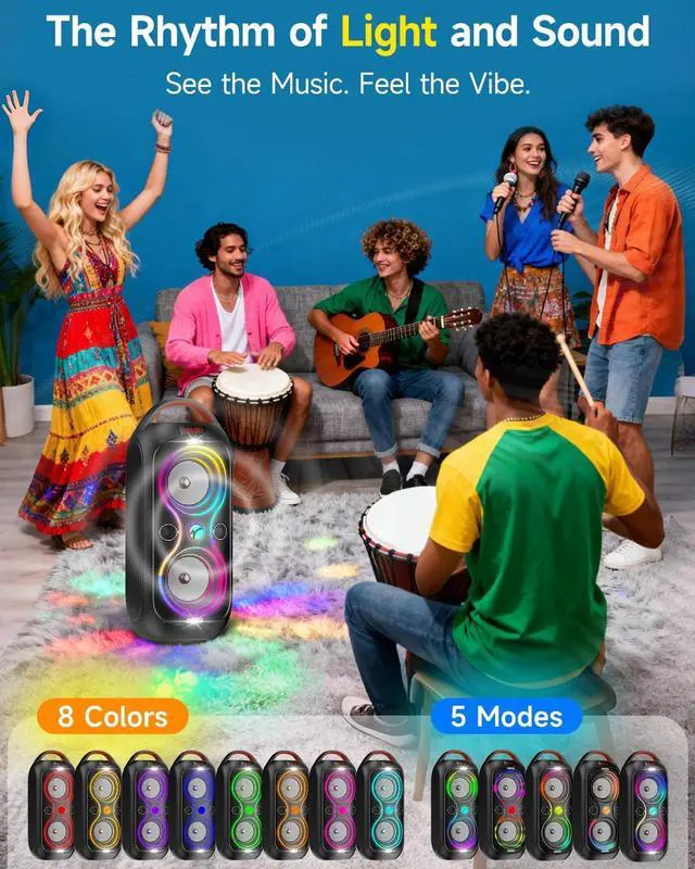 5 Dynamic Light Modes & 8 Colors - Personalize your sound with a variety of RGB options. Switch between 5 exciting lighting modes and 8 different colors to express your style and elevate any party.