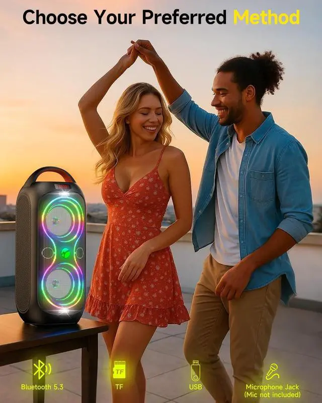 From Wireless Streaming to Karaoke Night - Designed for every audio need. Effortlessly switch between multiple inputs including stable Bluetooth 5.3, TF card, USB, and AUX. The dedicated MIC-IN port lets you connect an external microphone for karaoke or public speaking, while FM radio and TWS pairing complete your all-in-one audio solution.