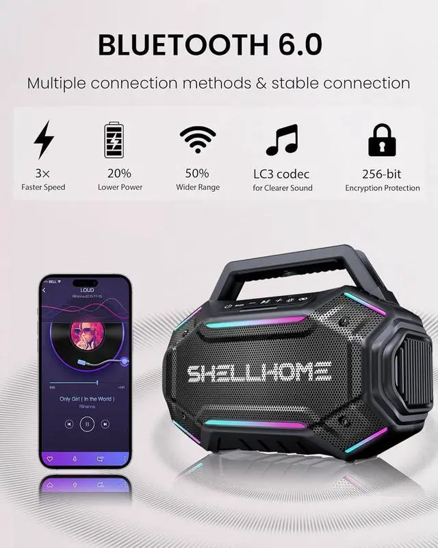 TWS & Bluetooth 6.0 SHELLHOME party bluetooth speakers equipped with advanced Bluetooth 6.0 technology for faster pairing and more stable connections. Pair two speakers via TWS mode to create true stereo sound for a more immersive listening experience.