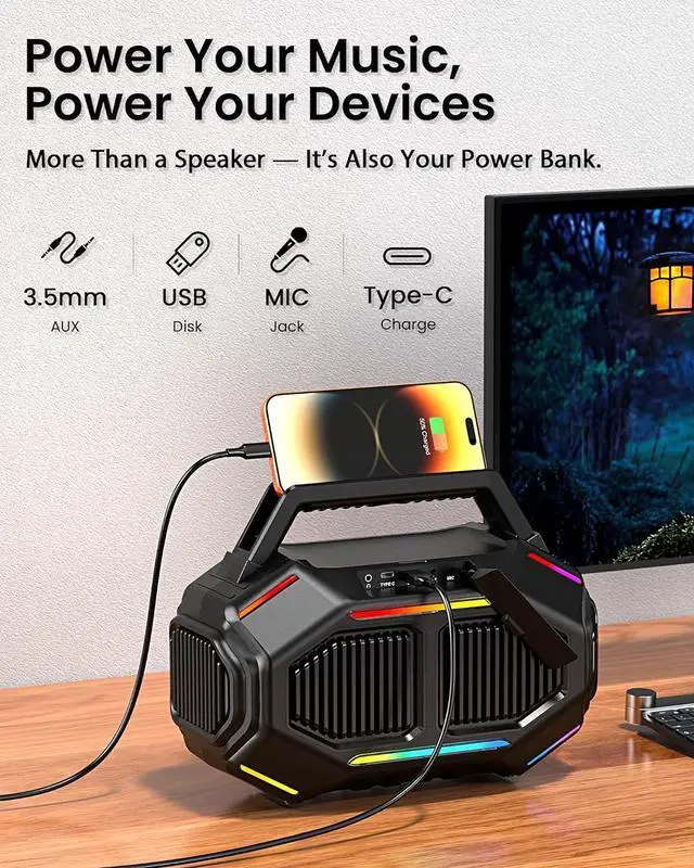 30H Long-Lasting Playtime The buletooth outdoor speaker fully charged in just 4 hours, the portable wireless speaker delivers up to 30 hours of continuous playtime. With a built-in power bank, it also keeps your devices charged so you can enjoy music all day without worries.