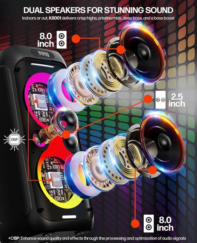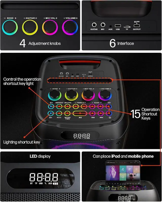 All-in-One Karaoke Machine:Equipped with Bluetooth 5.3 and two professional wireless mics, this system offers stable, low-latency connectivity. Dual 8-inch woofers and dual 2.5-inch tweeters deliver rich, balanced, immersive sound. Thoughtfully designed with 15 shortcut buttons, four independent volume knobs, and six I/O ports for effortless control. Features nine LED lighting modes, fast charging, and up to 24 hours of playbackideal for family gatherings, solo practice, or outdoor parties!