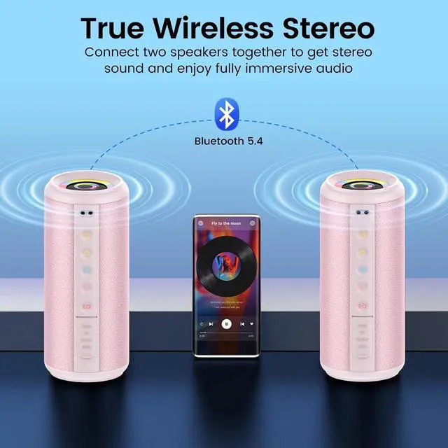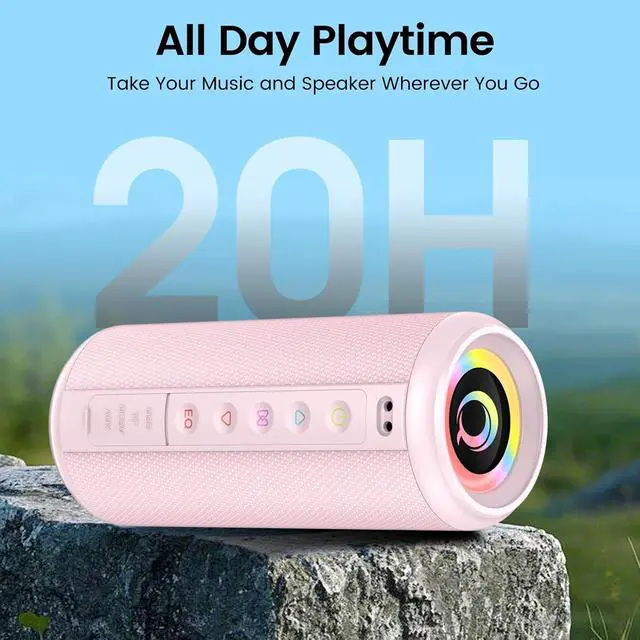 Portable Bluetooth Speaker, 2026 Bluetooth 5.4 Wireless Speaker with 20W HD Loud Stereo Sound, 20H Playtime, LED Lights, IP7, TWS Pairing, Built-in Mic, for Outdoor, Home, Beach, Party, Gift, Pink