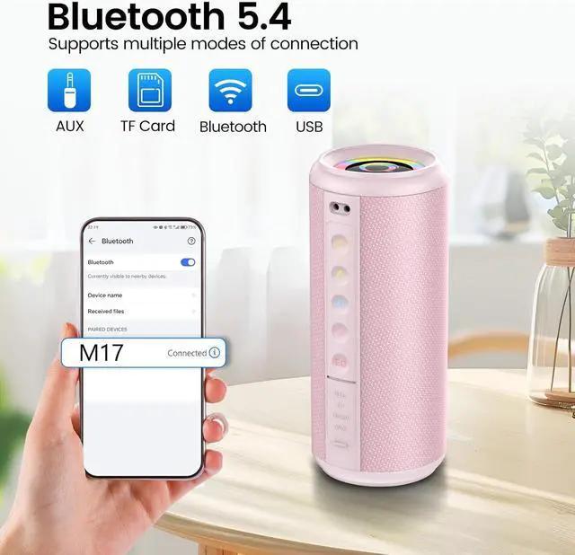 EQ Mode & RGB Colorful Light: M17 wireless Bluetooth speaker that changes the sound output of the speakers by adjusting the sound of different frequencies (e.g. bass, midrange, treble). Allows you to personalize your choices and optimize your music listening according to your personal preferences or different scenarios. And it comes with personalized adjustable LED lights.When playing music, there are eight types of lights that loop back and forth, allowing you to enjoy music better.
