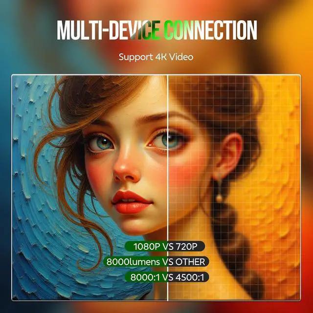 Support 4K With native 1920×1080 Full HD clarity and advanced 4K UHD decoding technology, this projector ensures razor-sharp detail for both 4K and Full HD content. Enhanced by a high-performance optical engine and a 6000:1 intelligent dynamic contrast system, every frame bursts with vivid brightness and lifelike depth. Whether streaming 4K movies or gaming in Full HD, enjoy immersive, theater-quality visuals with uncompromised clarity