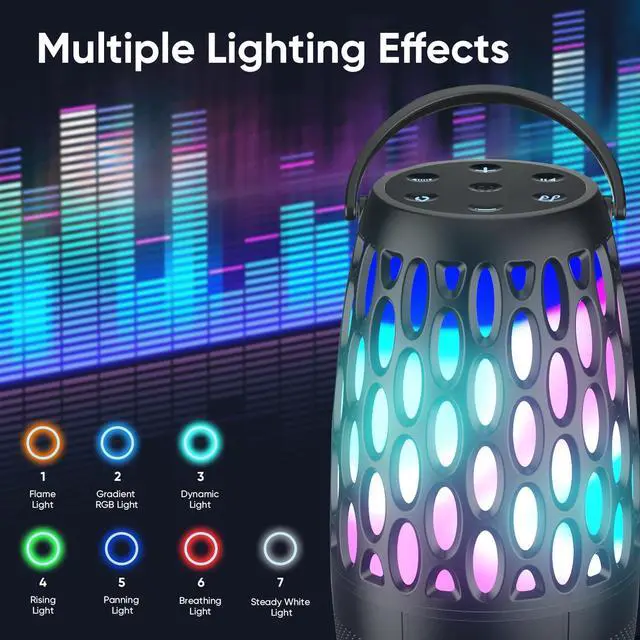 Not Just A Speaker - Its also a stunning atmosphere light or portable lantern with 7 lighting effects to match your mood. From flame light, gradient RGB light, dynamic light, rising light, panning light, breathing light to steady white light, it transforms any space into a visual and audio experience.