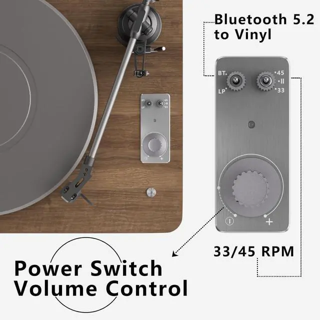 Transmission modeBelt DriveSpeed Support33 / 45 RPMWireless ConnectivityBluetooth 5.2Power Supply15V 2AColor & materialBlack walnut wood and dark gray fabricWeightItem: 20 lb, Total(with package): 27 lbDimensionsItem: 16.5 x 13.2 x 8.3 in, Package: 19.7 x 16.5 x 11.4 inSignal-to-Noise Ratio84.9 dbSensitivity83.9 dbBass Extension/Hz(-6dB)56 dbDistortion Factor/%(BT 1kHz)<0.5%Maximum Power/W(RMS)2 x 15WSpeaker Output2 x 20W 2.75 in Bass & 2 x 10W 1 in TweeterCartridge ModelAudio-technica AT-3600L More than a record player, It's a Lifestyle.