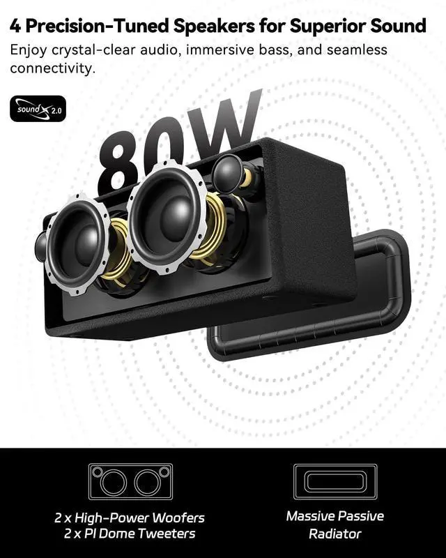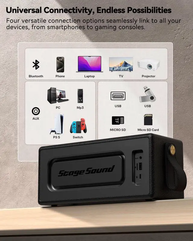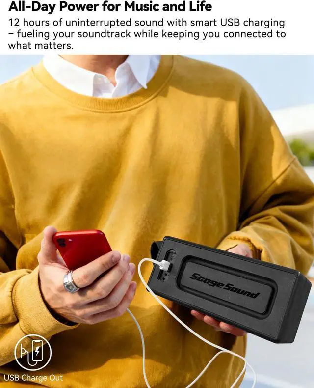 Output VoltageDC 5V/1AInput VoltageAC 100-240VCharging PortUSB-C (USB-A to USB-C cable included)Bluetooth Range10 meters / 33 feetUSB Drive PlaybackMP3 and WMA format filesMicrophoneHands-free calling supportedButton ControlsPlay/Pause, Volume adjustment, Mode switching, Track Skip, TWS connect, Battery level check Loud Bluetooth Speaker for Home Specifications