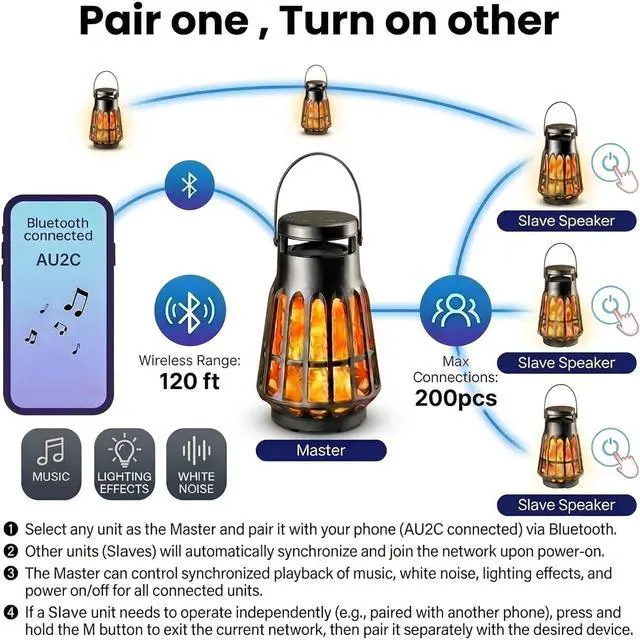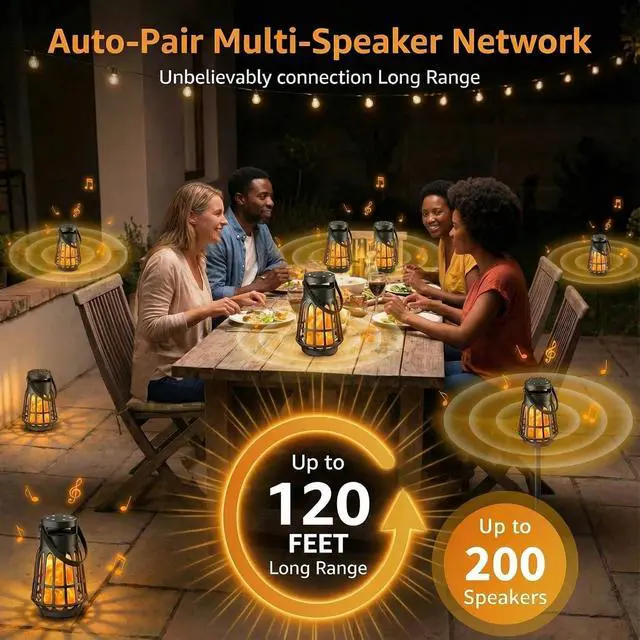 Stunning Light & Robust Sound:Switch between three dynamic 360° light showsflickering flame, breathing candlelight, or steady amberand enjoy crystal-clear audio powered by Bluetooth 5.4 and Auto-Pairing Auracast T technology. For bigger spaces, pair up to 200 speaks to create a synchronized surround sound and light experience.