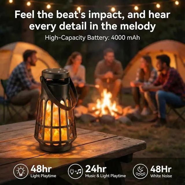 3-in-1 Ambiance & Audio Speaker:Experience sound and light in perfect harmony. This upgraded LED atmosphere speaker delivers 360° immersive audio while offering versatile lighting: choose from a realistic flickering flame effect, a bright white camping light, or a soft night-light glow. Its not just a speakerits your portable ambiance creator for any moment.