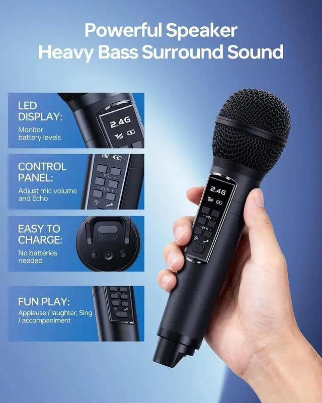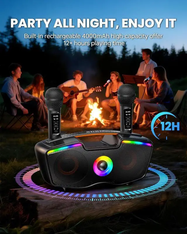 [Long-Lasting Battery] The karaoke machine's 4000mAh battery delivers 12 hours of playtime on a 23 hour charge. Its mics can be recharged in the speaker or via USB-C cable. You can also charge your devices through the speaker's USB port. Ideal for outdoor/indoor parties, family gatherings, church events, and more