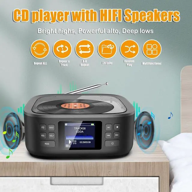 Rechargeable & Dual SpeakerThis portable cd player has a built-in high-capacity 3000 mAh rechargeable battery with a TYPE-C charging cable. Lets you listen to your favorite music and radio programs for a long time. The CD player is equipped with dual speakers, which produce great sound and let you enjoy a smooth stereo audio experience. It also supports five-tone EQ modes: Flat; ROCK; POP; JAZZ; CLASS, which Lets you enjoy music in a variety of textures