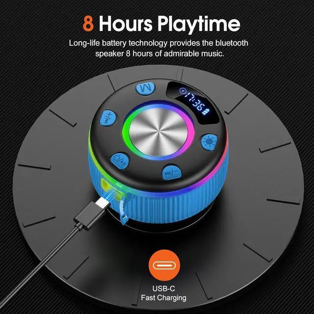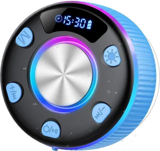 Loud Stereo Sound & Stable Bluetooth 5.3: Experience crystal-clear, room-filling audio with rich bass and minimal distortion. The advanced Bluetooth 5.3 chip ensures a faster, more stable connection with lower power consumption, so your music never drops out. True IPX7 Waterproof Protection: Don't worry about water or splashes. With an IPX7 rating, this speaker is fully waterproof and can even be submerged in water up to 1 meter for 30 minutes. Perfect for the shower, pool, beach, or in the rain. Dynamic RGB Mood Lights & Time Display: Set the vibe with colorful LED lights that create a party atmosphere. The built-in digital clock keeps you on schedule, making it easy to track time while you relax in the bath or get ready for the day. Secure Suction Cup & Ultimate Portability: The powerful suction cup locks securely onto any smooth surfacetile, glass, or your beach cooler. Its compact, lightweight design is made for adventure, easily fitting into your bag for travel, hiking, or cycling.