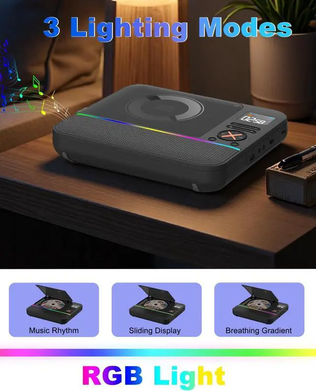 Desk CD Player with RGB LightThe back of the CD player is designed with a hidden stand. With the bracket in place, the CD player can be stably placed on a bookshelf, table or cabinet very conveniently and save more space. desk CD player with RGB lighting with 3 color changing modes (Music Rhythm, Sliding display, Breathing gradient) to give you a magical visual and auditory effect