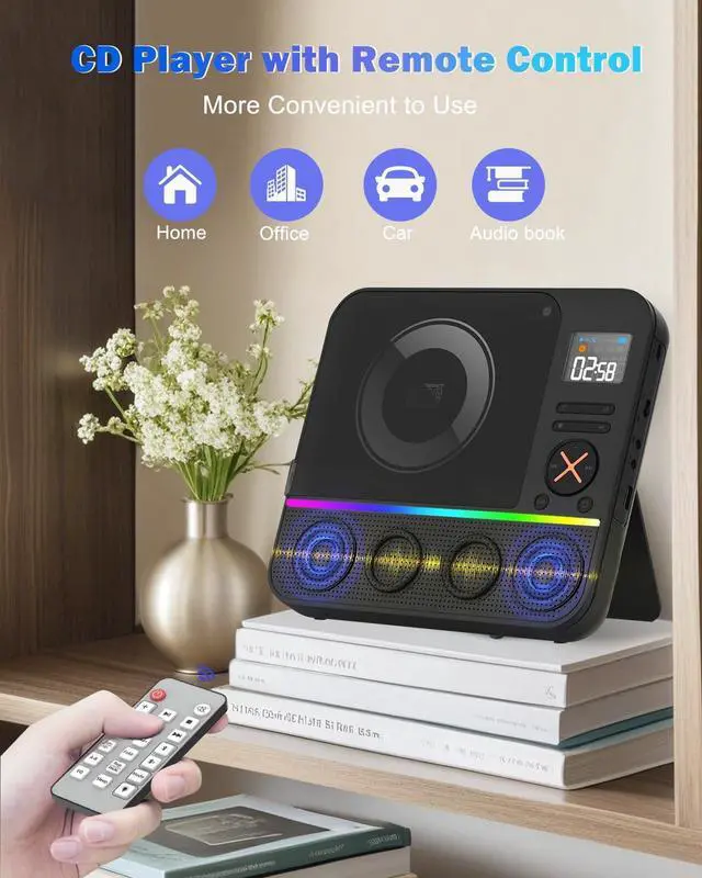 Wide Applications & Perfect GiftThe Multifunctional cd player is suitable for yoga, gym exercise, home party, language learning, enjoy audiobooks, early learning and fetal education, perfect present for kids, elders, parents, friends, lovers and pregnant women etc. Package included: 1* CD player, 1* type-C cable,1*AUX cable, 1*remote control, 1*user manual