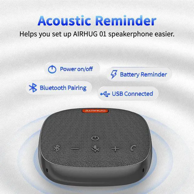 Acoustic Reminder-You will be easy to control the AIRHUG 01 speakerphone. AIRHUG 01 provides the acoustic signal reminder when you operate power on/off, bluetooth connection and USB linking mode. Please note that,when AIRHUG 01 is in normal connection state (not in call mode), you can turn off the voice broadcast by pressing and holding the Answer/End call button for 3 seconds