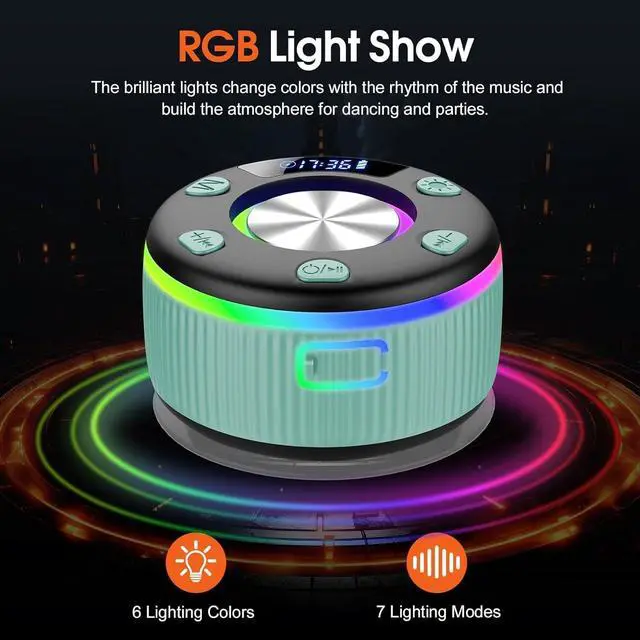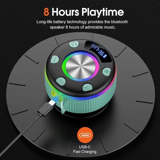 Dynamic LED Light Show and 8-Hour Playtime: PRSCFUM portable shower speaker Bluetooth waterproof features 7 lighting modes and 6 vibrant colors. These colors flash and blend in perfect sync with the beat, creating a unique pulsating light show for every song. This adds vibrancy to your music parties and enhances both your auditory and visual experience. With its built-in 1000mAh battery, you can enjoy 7-8 hours of continuous playback at 40% volume after just a 1.5-hour charge