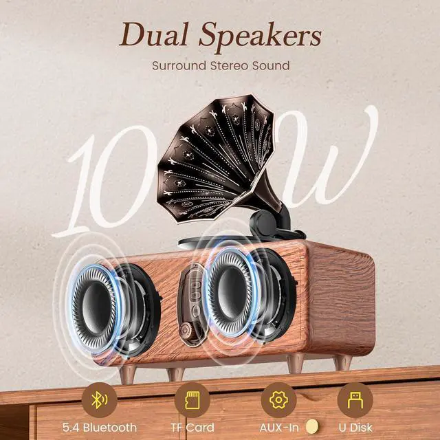 Retro DesignThis retro Bluetooth speaker, with its classic horn shape and wood grain print, instantly becomes a highlight of your home décor. Dimensions: 7.24*3.93*7.99 inches. Whether placed in the living room, bedroom, study, or office, it will add a unique artistic touch to your space. It's not just a speaker, but a work of art that elevates your home's style.