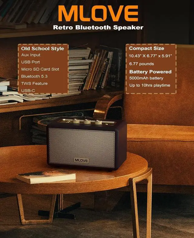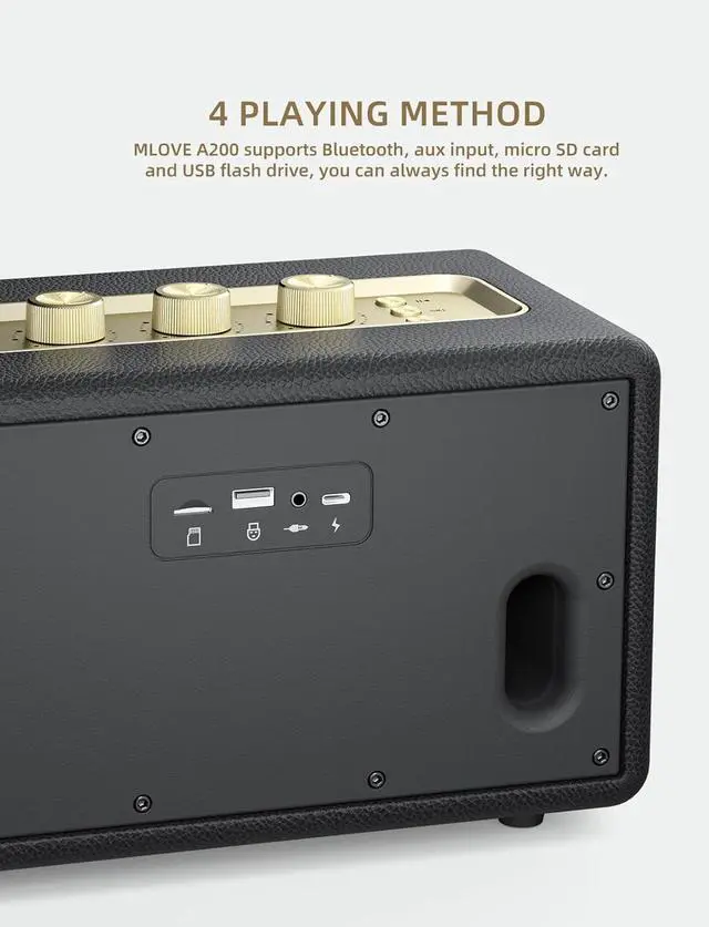MLOVE A200 retro bluetooth speaker combines classic vintage design with modern functionality. It features easy-to-use treble, bass, and volume control knobs, allowing you to effortlessly fine-tune your sound to perfection. With 4 inch subwoofer and 2.6 inch tweeter, up to 80W powerful output, it fills your house with rich, dynamic sound. The wireless speaker is powered by a USB-C rechargeable battery, offering up to 10 hours of continuous playtime on a single charge. Whether you're hosting a party or relaxing at home MLOVE A200 bluetooth speaker could provide you an unforgettable listening experience