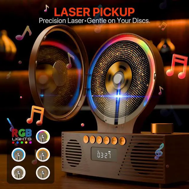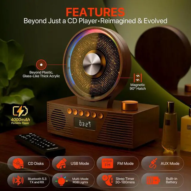 Retro Design & Mood LightsThis vintage-looking cd player features a retro design with transparent magnetic suction panel and colorful mood lights, causing a charming ambiance. Its cute cd player style adds a decorative touch to any room, ideal for home decor as a desktop stereo.