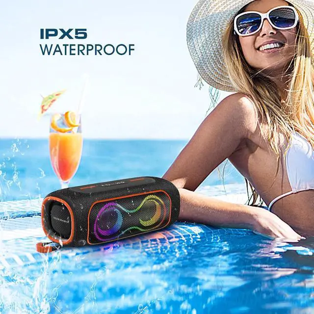IPX5 Waterproof Bluetooth SpeakerThis outdoor speaker bluetooth features eco-friendly waterproof fabric, offering all-around protection against splashes, dust, and rain. This portable waterproof bluetooth speakers can be placed upright, laid flat, or hung using the included strap, suitable for beach and pool parties, boat deck, or rainy backyard barbecue
