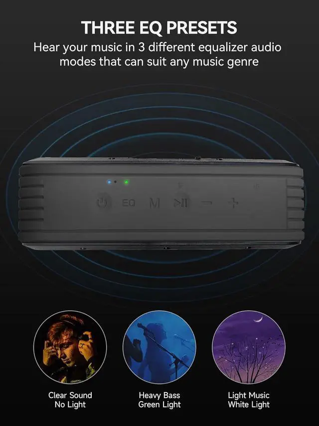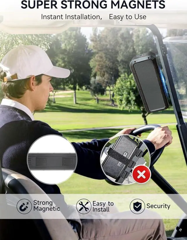 40W Superior Sounds and Three EQ Presets: This magnetic bluetooth speaker for golf carts offers powerful 40W stereo sound with dual drivers and a passive radiator; Easily switch between three EQ presets with the press of a button for customized listening