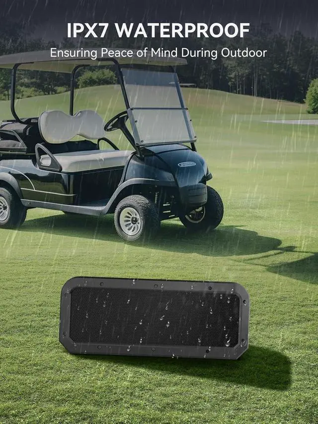 IPX7, Durable & Rugged Body: This golf cart bluetooth speaker is protected by rubber and metal for durability against shock, dust, and impact. Its IPX7 waterproof rating makes it ideal for any adventure, perfect as a portable outdoor waterproof speaker