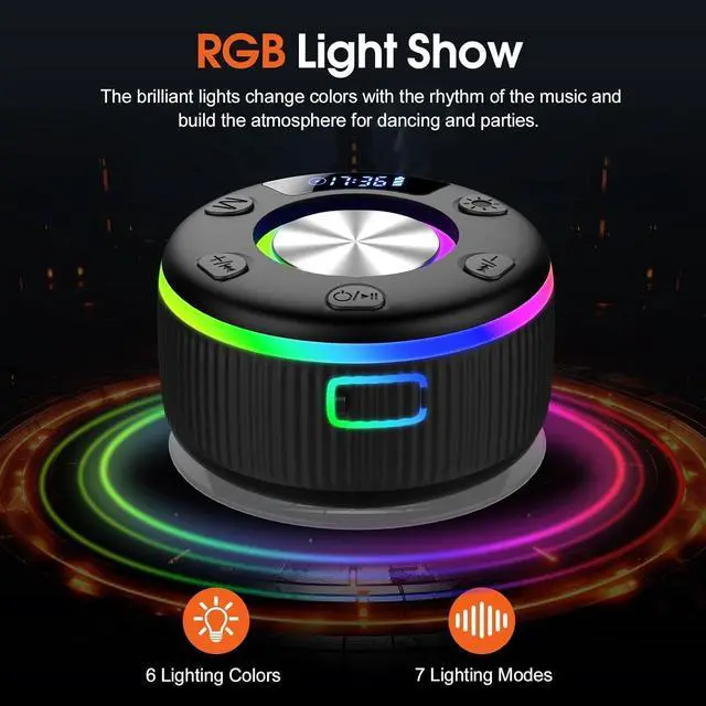 Dynamic LED Light Show and 8-Hour Playtime: PRSCFUM portable shower speaker Bluetooth waterproof features 7 lighting modes and 6 vibrant colors. These colors flash and blend in perfect sync with the beat, creating a unique pulsating light show for every song. This adds vibrancy to your music parties and enhances both your auditory and visual experience. With its built-in 1000mAh battery, you can enjoy 7-8 hours of continuous playback at 40% volume after just a 1.5-hour charge