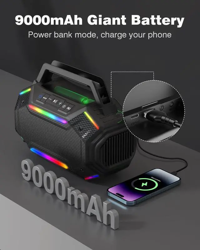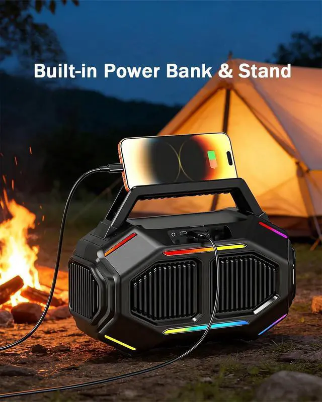 Multi-functional Speaker: With just a simple press, transform any gathering into a professional-level party, featuring 7 RGB colors and 6 lighting modes. This is more than just a speakerit also doubles as a power bank, allowing you to charge your phone via USB-C while using the built-in phone stand. A versatile all-in-one device packed with practical features.