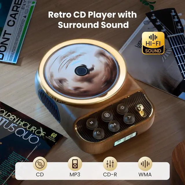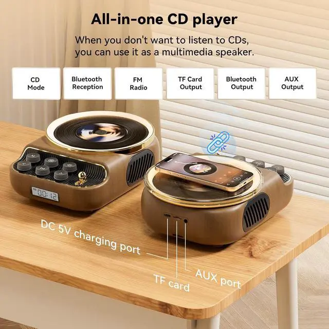 Retro CD Player with 5.4 Bluetooth Speaker: The retro CD player combines classic records with modern wireless technology. Whether playing CD or Bluetooth music, you can enjoy the shocking HI-FI bass and clear treble brought by the 10W dual stereo speakers. The LCD display clearly displays the play mode (CD/Bluetooth/FM/TF card), and the operation is clear at a glance.