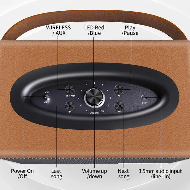 Built-in AUX Interface This Bluetooth speaker is equipped with a 3.5mm AUX input interface, allowing you to easily play music from turntables, CDS or MP3 players via wired connection.