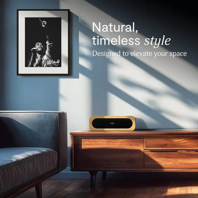 SUSTAINBLY CRAFTED: Made from responsibly sourced bamboo and REWIND fabric - crafted using recycled PET for a stylish, hard-wearing finish - this speaker delivers outstanding performance with thoughtful design