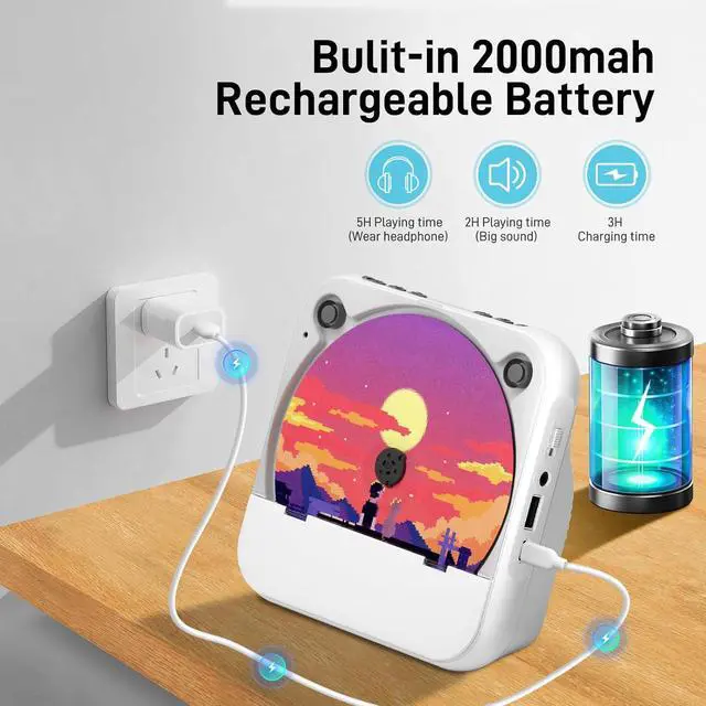 Rechargeable and Long play TimeHigh capacity, up to 5 hour/ 30-song playtime.This CD player portable has a built-in 2000mAh rechargeable battery.This Wireless Bluetooth Portable CD Player makes it easy to share and listen to music wherever you go such as travel, hiking, camping.