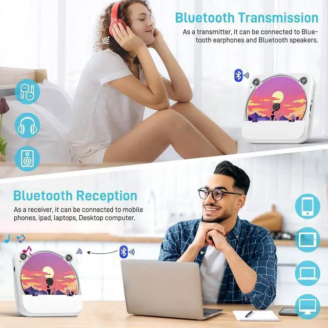 Multifunctional Bluetooth Portable CD PlayerCompatible with all Bluetooth-enabled devices. Instantly connect to your smartphone or tablet.This portable CD player supports multiple CD formats-CD,CD-R;CD-RW;MP3;WMA,You can freely listen to your cherished CDs or idols' CDs at home.