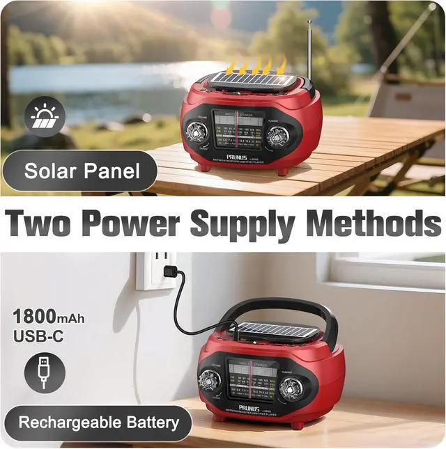 Dual Power SupplyDon't let a dead battery stop the fun. Our rechargeable radio offers 2 convenient ways to stay powered: a built-in 1800mAh battery with modern USB-C charging and a eco-friendly solar power. Whether you're at home, on a picnic, camping, or during a power outage, it provides a reliable power supply to ensure your music and news never stop.