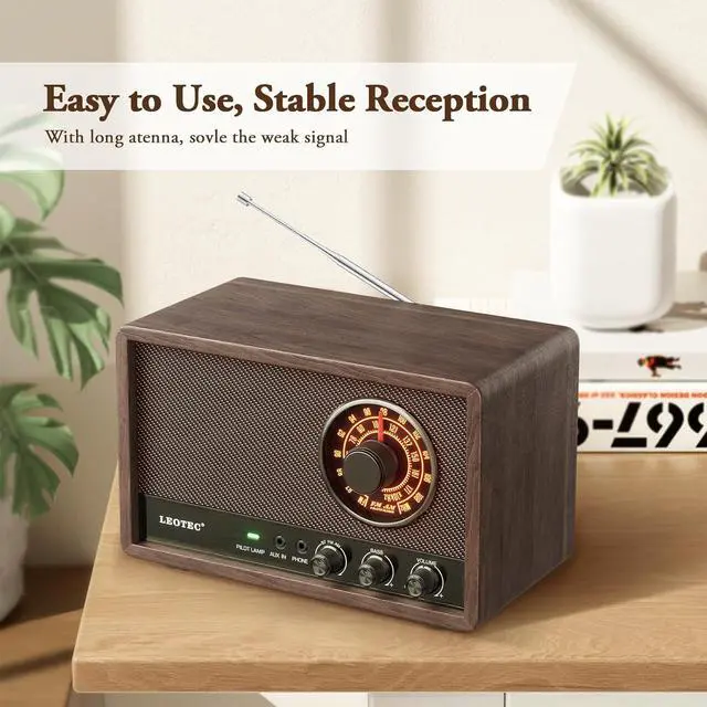 Stable Reception and Great SoundThis LEOTEC retro looking radio has great reception and excellent sound quality, perfect for listening to your favorite stations while you work, cook, or relax. The wooden construction also adds a warm and inviting feel to any space. You can enjoy your music and radio with ease and style